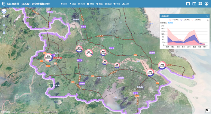 1、长江经济带(江苏段)地理信息系统:构建长江(江苏段)近二十年一张空间底图,并结合多行业的专题数据,为省政府相关部门客观掌握长江江苏段的历史和现状资源、岸线、生态、利用等情况,实现长江经济带(江苏段)的布局、管控、保护和生态环境修复提供科学决策支持。