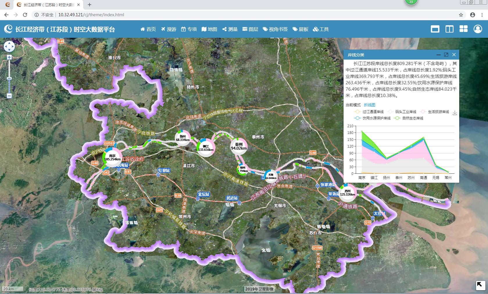 平台整合了2000-2019年长江(江苏段)卫星和航空影像照片,以及地形地貌数据、长江岸线、入江支流等信息,形成一套江苏境内800余千米长江岸线动态、完整、无缝的电子底图,以时间和空间维度,宏观、微观和漫游视角客观展现长江(江苏段)地理环境全貌;同时,通过收集各部门权威数据,服务生态环境突出问题整改。如:基于统一的长江(江苏段)底图,利用交通厅提供的非法码头数据,对应各类非法码头拆除或整改情况进行展示、统计分析,服务长江(江苏段)非法码头专项整治。
