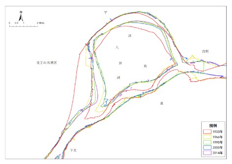 3、利用南京百年历史地图和长时间序列遥感影像等数据,结合长时间序列行业专题资料,分析南京百年水系变化情况。此次项目选取1933、1966、1990、2005、2014年5期水系矢量数据分别计算其河网密度、水面率、支流发育系数、盒维数等常见水系参数,简要概述南京的水系变化。